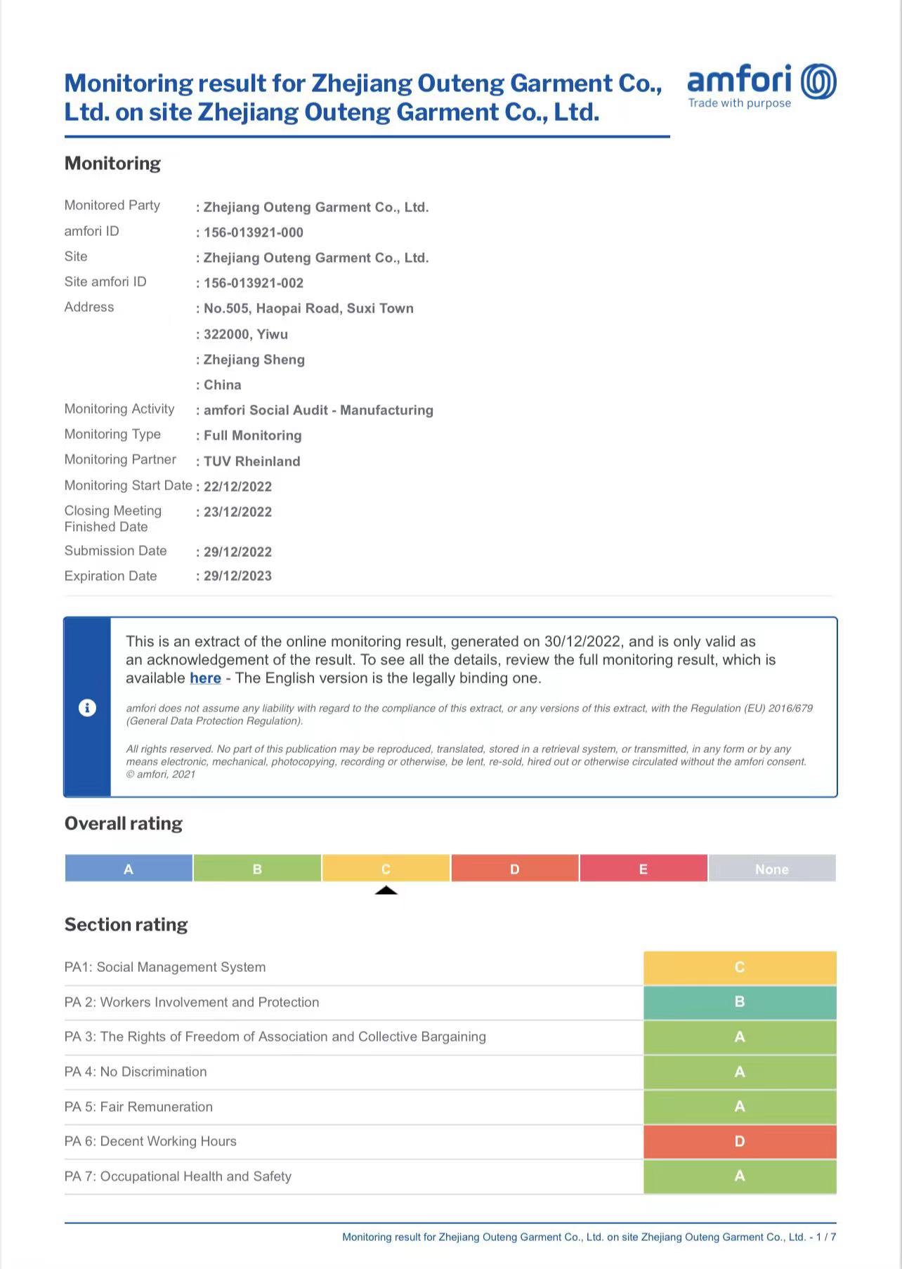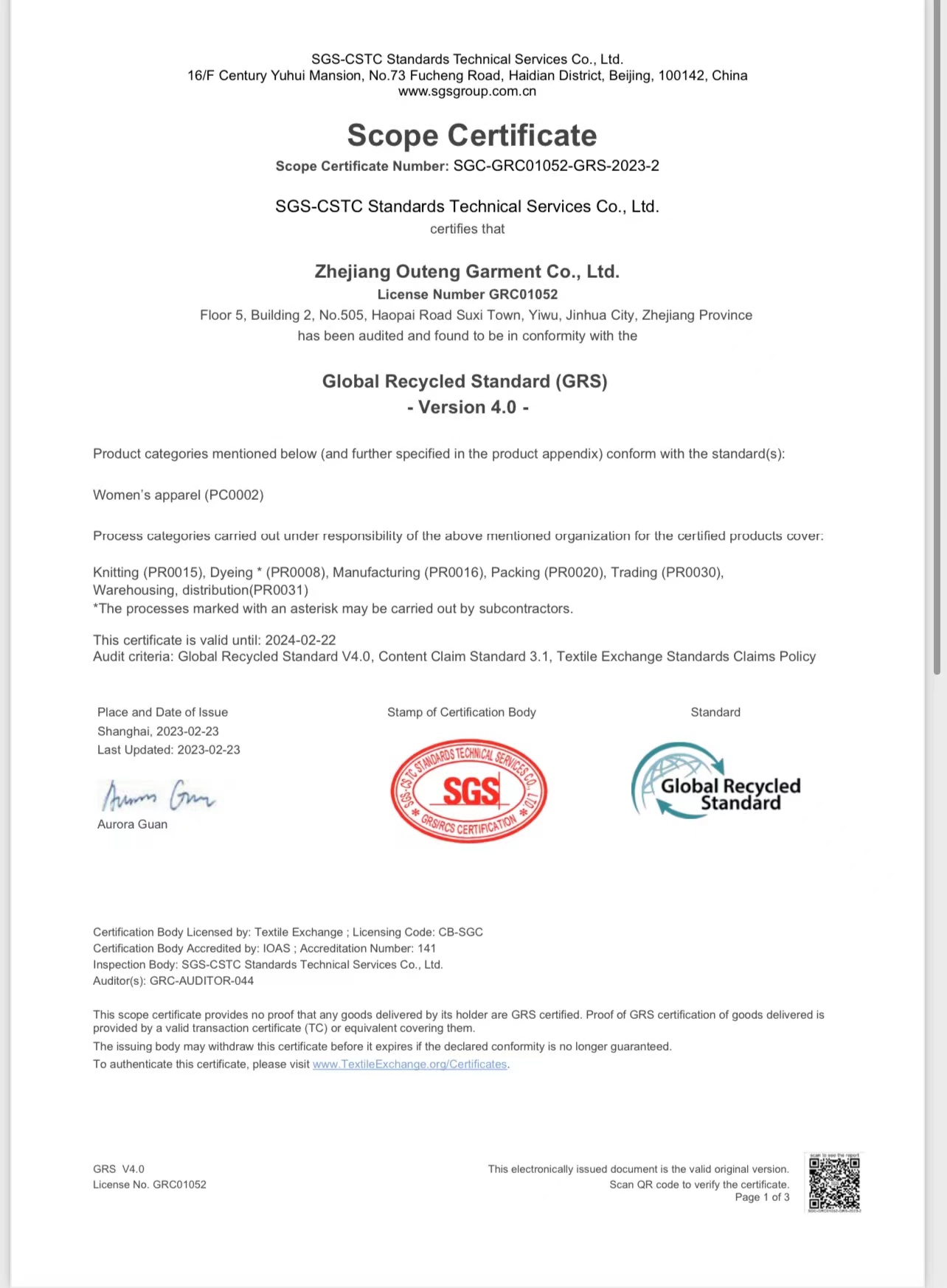 浙江歐騰服飾有限公司位于世界小商品之都-義烏。創立于2015年,是一家專業生產無縫針織運動服飾和內衣的工貿一體企業,擁有自主出口權。 工廠的占地面積約16000平方米 ,引進了大型圣東尼、高騰等多種先進的制衣設備300余臺。月產能可達90萬件。 歐騰服飾每年投入近百萬資金打樣開發新產品,有著一支高素質設計、技術員工隊伍。工廠先后通過了ISO 9001質量管理體系認證、BSCI認證、GRS認證、OEKO-TEX國際生態紡織品認證等多項專利檢測報告??商峁㎡EM&ODM服務。歐騰服飾以一套完整、科學的質量管理體系,生產的服裝從原材料紗線到成衣,質量完全能夠滿足國內、國際質量要求。獲得了客戶一致好評。工廠先后獲得省科技型企業、國家高新企業、義烏市誠信講信用單位、規上企業、信用AAA級等榮譽。